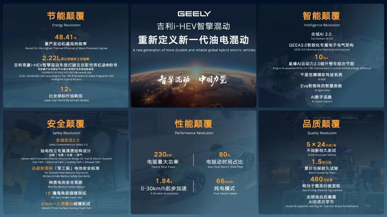 从2.22L油耗到48.41%热效率,从AI云动力到冗余安全,吉利i-HEV智擎混动用实打实的数据和测试,证明了国产油电混动技术已经具备全球领先的实力。