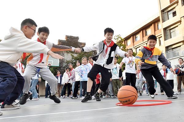 △2023年10月31日,江苏扬州,广陵小学“课间十分钟”,同学们正在操场上“抢皮球”。